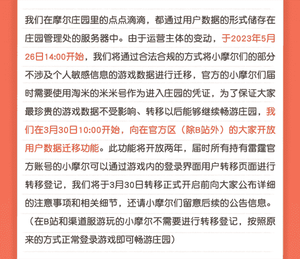 因此针对账号问题,,,,双方第一时间就在公告中表示会“长期开放用户数据迁移功能”,,,“保证大家最珍贵的游戏数据不受影响、、、、转移以后能够继续畅游庄园”。。。。3月30日后,,,,玩家可以根据后续的公告说明自行操作,,,,将账号绑定在淘米游戏的米米号上,,,后续使用米米号登录。。。。