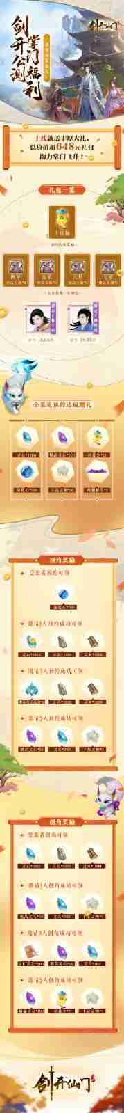 游戏为大家准备了海量的福利,,,,包括上线即可获得的全渠道预约礼包、、、十连抽等福利,,输入密令“JK666”、、、“JK888”即可领取紫色弟子,,达到金丹期后还有功法宝箱可领,,,助力全宗上下实力提升……所有奖励总价值超过648元,,,,而邀请好友一起体验,,更可以获得额外的奖励哦~