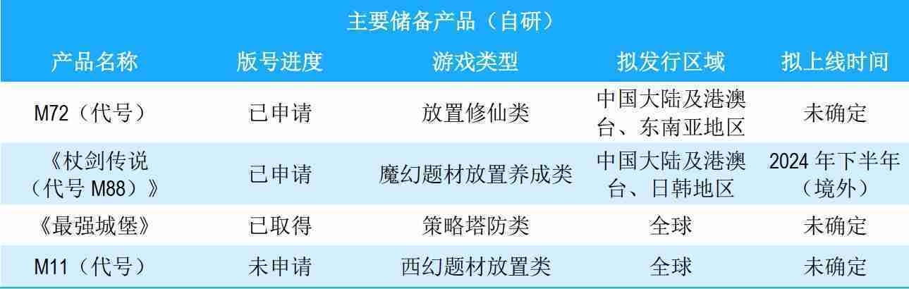 公司储备的多个自研、、代理产品都在有序推进当中,,涵盖放置类、、策略类、、模拟经营类、、RPG、、Roguelike等多元化游戏品类,,,,储备的主要自研和代理产品如下:::